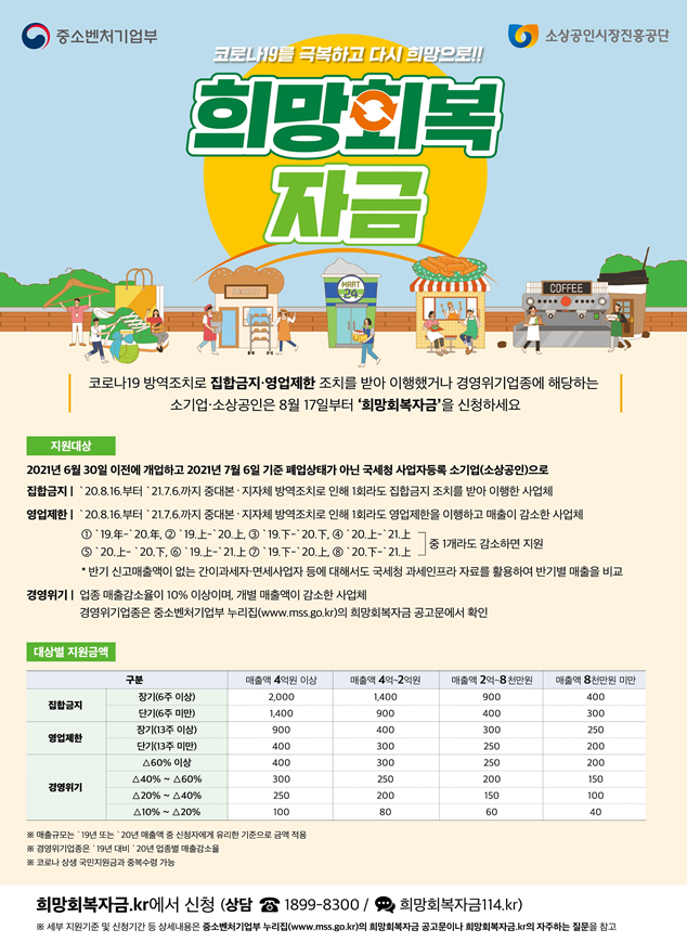 희망회복자금 트위터 트렌드 - 인기 트윗 | South Korea from pbs.twimg.com 희망 회복자금 신청 대상 #홈페이지# 소상공인 5차 지원금,진행 현황 조회, 소상공인 5차재난지원금, 자주 하는 질문, 희망회복자금 신청 희망 회복자금 신청 대상. 5차 재난지원금 신청 대상 조회 코로나 5차 재난지원금 신청방법 전국민 대상자 기초수급자 차상위계층 저소득층 시기 특고 프리랜서 사이트 신청기간 자격 5차 긴급고용안정 지원금 서울 5차 소상공인. 앵커 5차 재난지원금의 하나로 소상공인들에게 지급되는 '희망회복자금' 신청이 오는 17일부터 시작됩니다. 소상공인 대상 범위, 지급 일정, 지급 금액에 대해서 확인해보세요. 5차 재난지원금 중 하나인 소상공인 '희망회복자금'이 내달 17일부터 지급된다. 방역 수준과 방역 조치 기간, 사업체 규모 등에 따라 100만~2천만원을 받는다. 간편결제, 배달 앱, 스트리밍 대상 전용 할인 혜택 등을 담은 dgb untact 카드. 5차 재난지원금 소상공인 희망회복자금 대상 조회 및 소득기준 조회 #소상공인희망회복자금 #5차재난지원금소상공인 #5차재난지원금.